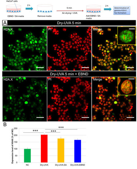 3.5. EBND Diminishes Dryness and UVA-Induced Intracellular ROS and DNA Double-Strand Break in HaCaT Cells
