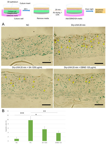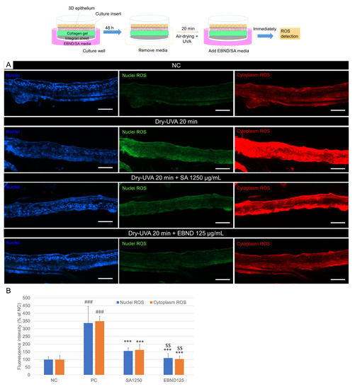 3.6. EBND Diminishes Dryness and UVA-Induced Apoptosis and ROS Production in 3D Epithelium Equivalents