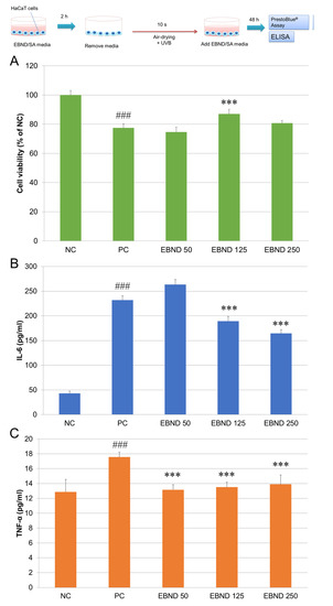 3.7. EBND Suppresses UVB-Induced Inflammatory Cytokines Secretion in HaCaT Cells