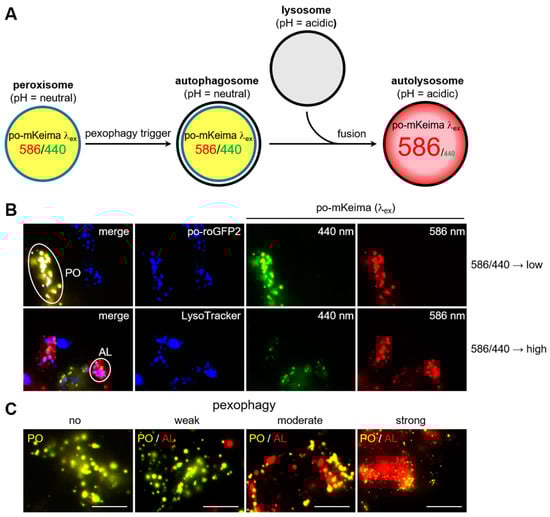 Pexophagy detection in living cells using po-mKeima. (A) Schematic outline. (B) Colocalization analysis between the peroxisomal marker po-roGFP2 (false color: blue) or the acidotropic fluorescent probe LysoTracker (false color: blue) and po-mKeima excited at 440 nm (false color: green) or 586 nm (false color: red). The yellowish (=low 586/440 excitation peak ratio) and reddish (=high 586/440 excitation peak ratio) dots represent peroxisomes (PO) and autolysosomes (AL), respectively. (C) Examples of DD-DAO/po-mKeima Flp-In T-REx 293 cells displaying no, weak, moderate, or excessively high levels of pexophagy. Scale bar, 10 µm.