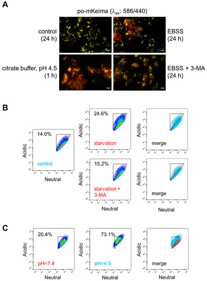 In situ detection of starvation-induced pexophagy. DD-DAO Flp-In T-REx 293 cells stably expressing po-mKeima were precultured for two days in rMEMα. At time zero, the medium was replaced with pre-warmed rMEMα (control), Earle’s balanced salt solution (EBSS) supplemented or not with 5 mM 3-methyladenine (3-MA), or a citrate buffer (pH 4.5). After the indicated times, the cells were processed for fluorescence microscopy or FACS analysis. (A) Representative images of the po-mKeima staining patterns in each group. Images were captured as described in the Section 2. Scale bar, 10 µm. (B,C) Representative flow cytometry plots of each group. Note that a decrease or increase in the fluorescence intensities of the neutral and acidic channels can be used to gate and quantify the percentage of cells undergoing pexophagy (starvation) and acidification of the peroxisome lumen (citrate buffer, pH 4.5), respectively. The different colors represent the cell density at a given position.
