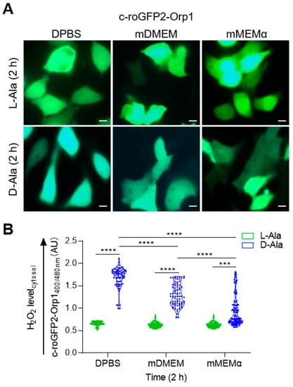 Effect of assay medium on peroxisomal H2O2 release. DD-DAO Flp-In T-REx 293 cells were cultured for 3 days in rMEMα containing 1 µg/mL DOX and 500 nM Shield1 (for details, see Section 2). Next, the cells were transfected with a plasmid encoding c-roGFP2-Orp1, a highly responsive cytosolic H2O2 sensor, and chased for one day in rMEMα without DOX/Shield1. Thereafter, the cells were incubated in different assay media (DPBS, mDMEM, or mMEMα; for details, see Section 2) and, after the addition of L- or D-Ala, the cytosolic H2O2 levels were monitored over time (the results obtained after 4, 8, and 24 h can be found in supplemental Figure S2). (A) Representative fluorescence overlay images of c-roGFP2-Orp1 on excitation at 400 (false color: blue) and 480 (false color: green) nm. Scale bar, 10 µm. (B) Response ratios of c-roGFP2-Orp1 after 2 h treatment. The data obtained for the D-Ala conditions were statistically compared as indicated in the graph (***, p < 0.001; ****, p < 0.0001).