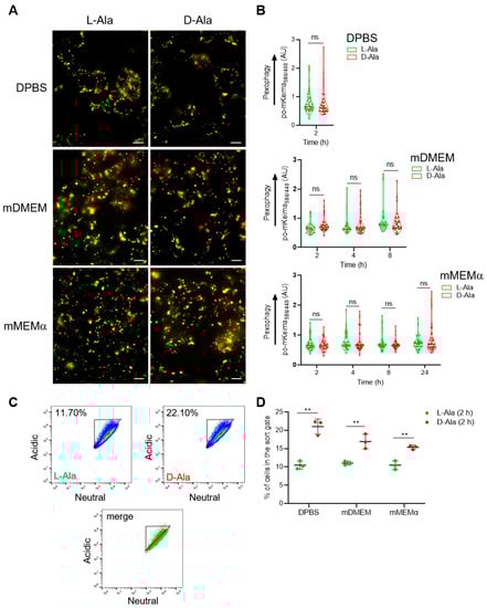 Peroxisome-derived H2O2 does not trigger pexophagy in po-mKeima/DD-DAO Flp-In T-REx 293 cells. DD-DAO Flp-In T-REx 293 cells stably expressing po-mKeima were cultured as described in the legend to Figure 3. The cells were subsequently transferred to different assay media (DPBS, mDMEM, or mMEMα; for details, see Section 2) supplemented with 10 mM L- or D-Ala. (A) Representative fluorescence overlay images of po-mKeima on excitation at 440 (false color: green) and 586 (false color: red) nm. Scale bar, 10 µm. (B) The po-mKeima 586/440 nm excitation fluorescence ratios. The data represent the values of the independent biological replicates. The corresponding D- and L-Ala data were statistically compared, but no significant differences were found. (C) Examples of flow cytometry plots for cells transferred to DPBS for 2 h. The different colors represent the cell density at a given position. (D) Quantification of the percentage of cells in the gated area. Data are shown as the mean ± SD (n = 3). The corresponding D- and L-Ala data were statistically compared (ns, non-significant; **, p < 0.01).