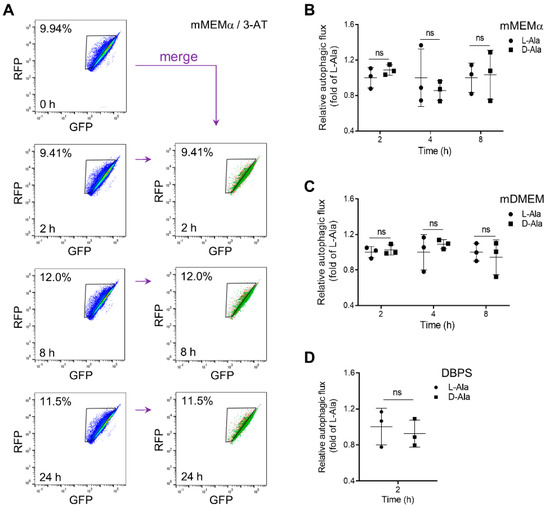Enhanced levels of po-H2O2 do not induce autophagy in mRFP-GFP-LC3B DD-DAO Flp-In T-REx 293 cells. DD-DAO Flp-In T-REx 293 cells stably expressing RFP-GFP-LC3 were cultured as described in the legend to Figure 3. Next, the cells were assayed in (A) mMEMα supplemented with 10 mM 3-amino-1,2,4-triazole (3-AT), (B) mMEMα supplemented with 10 mM L- or D-Ala, (C) mDMEM supplemented with 10 mM L- or D-Ala, or (D) DPBS containing 10 mM L- or D-Ala (for medium details, see Section 2). At the indicated time points, the cells were harvested and processed for FACS analysis. To measure the percentage of cells undergoing autophagy, the RFP-GFP-LC3 single-cell populations were gated for a decrease in GFP expression. The results are shown as flow cytometry plots (n = 1; the different colors represent the cell density at a given position.) or interleaved scatter plots (n = 3; data represent the means ± SD). The corresponding D- and L-Ala data were statistically compared (ns, non-significant).