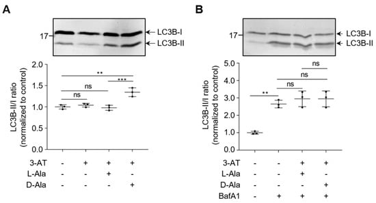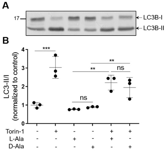 Moderate levels of po-H2O2 do not affect the processing of LC3B-I to LC3B-II. DD-DAO Flp-In T-REx 293 cells were cultured as described in the legend to Figure 3 and pre-incubated or not pre-incubated with 1 µM Torin-1 for 8 h. Thereafter, the cells were transferred to mMEMα (for details, see Section 2) supplemented with 10 mM L-Ala, 10 mM D-Ala, and/or 1 µM Torin-1. After 2 h, the cells were processed for immunoblotting with an antibody specific for LC3B. (A) Representative immunoblot. (B) Quantification of the LC3B-II/LC3B-I ratios. The data represent the means ± SD of three independent experiments. ***, p < 0.005; **, p < 0.01; ns, non-significant.