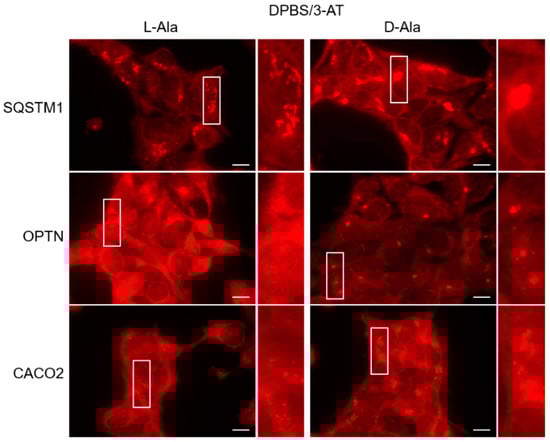 The specific autophagy receptors SQSTM1, OPTN, and CACO2 aggregate in response to peroxisome-derived H2O2 production. DD-DAO Flp-In T-REx 293 cells were cultured as described in the legend to Figure 3. The cells were subsequently transferred to DBPS containing 10 mM 3-amino-1,2,4-triazole (3-AT) and 10 mM L- or D-Ala. After 60 min, the cells were fixed and processed for immunofluorescence microscopy using rabbit antisera against SQSTM1, OPTN, or CACO2 in combination with a goat anti-rabbit secondary antibody conjugated to Texas Red. The panels shown on the right of each image are magnified views of the boxed areas. Scale bars, 10 μm.