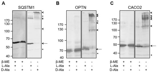 The specific autophagy receptors SQSTM1, OPTN, and CACO2 are prone to oxidation by peroxisome-derived H2O2. DD-DAO Flp-In T-REx 293 cells were cultured as described in the legend to Figure 3. Next, the cells were incubated in DBPS containing 10 mM 3-amino-1,2,4-triazole and 10 mM L- or D-Ala. After 60 min, the free thiol groups were blocked with N-ethylmaleimide. Thereafter, the cells were processed for SDS-PAGE under non-reducing (-β-ME) or reducing (+β-ME) conditions and subsequently subjected to immunoblot analysis with antibodies specific for (A) SQSTM1, (B) OPTN, or (C) CACO2. The migration points of relevant molecular mass markers (expressed in kDa) are shown on the left. The arrows and arrowheads mark the non-modified and oxidatively modified proteins, respectively. The asterisks mark bands of unknown nature.