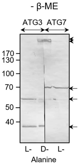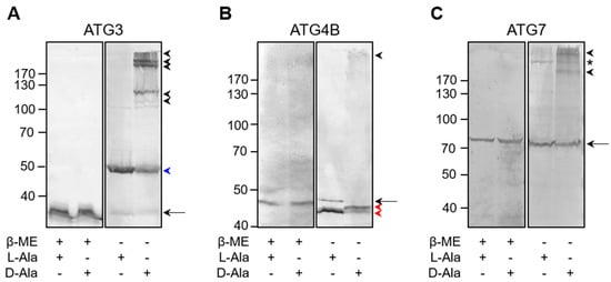 The core autophagy machinery proteins ATG3, ATG4B, and ATG7 are prone to oxidation by peroxisome-derived H2O2. DD-DAO Flp-In T-REx 293 cells were cultured as described in the legend to Figure 3. Next, the cells were incubated in DBPS containing 10 mM 3-amino-1,2,4-triazole and 10 mM L- or D-Ala. After 60 min, the free thiol groups were blocked with N-ethylmaleimide. Thereafter, the cells were processed for SDS-PAGE under non-reducing (-β-ME) and reducing (+β-ME) conditions and subsequently subjected to immunoblot analysis with antibodies specific for (A) ATG3, (B) ATG4B, or (C) ATG7. The migration points of relevant molecular mass markers (expressed in kDa) are shown on the left. The arrows and arrowheads mark the non-modified and oxidatively modified proteins, respectively. The blue and red arrowheads indicate, respectively, the disulfide-bonded ATG3-LC3 complex [18] and intramolecular disulfide-bonded forms of ATG4B [20]. The asterisk marks a band of unknown nature.