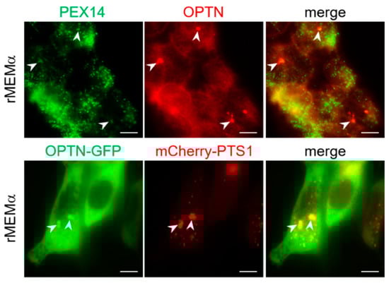 Endogenous and GFP-tagged OPTN can be recruited to peroxisomes under basal growth conditions. DD-DAO Flp-In T-REx 293 cells were co-transfected (lower panels) or not co-transfected (upper panels) with plasmids encoding OPTN-GFP and mCherry-PTS1. After culturing the cells for two days in rMEMα, they were processed for live-cell imaging (lower panels) or fixed and processed for immunofluorescence microscopy using a mouse antiserum against PEX14 and a rabbit antiserum against OPTN, in combination with goat anti-mouse and anti-rabbit secondary antibodies conjugated to Alexa Fluor 488 and Texas Red, respectively (upper panels). The white arrowheads point to sites of colocalization between OPTN(-GFP) and the peroxisomal marker protein PEX14 or mCherry-PTS1. Scale bar, 10 µm.