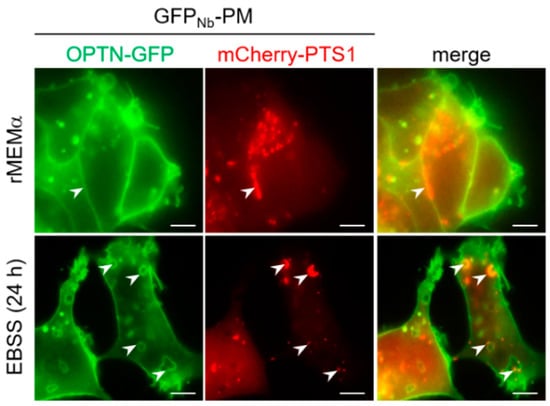 To investigate the significance of our observation that OPTN can sporadically be observed on peroxisomes under basal growth conditions, we carried out additional immunofluorescence and live-cell imaging experiments. From these studies, it can be concluded that both endogenous as well as ectopically expressed OPTN-GFP can be recruited to peroxisomes (Figure 12). This was further evidenced by a plasma-membrane-targeted anti-GFP nanobody (GFPNb-PM)-based translocation assay (Figure 13), in which a GFP-tagged protein of interest is relocated to the plasma membrane together with its (soluble or membrane-bound) interaction partner(s) [39]. Last but not least, overexpression of OPTN-GFP resulted in a significant decrease in peroxisome number (Figure 12), a phenomenon coinciding with pexophagy induction (Figure 14).