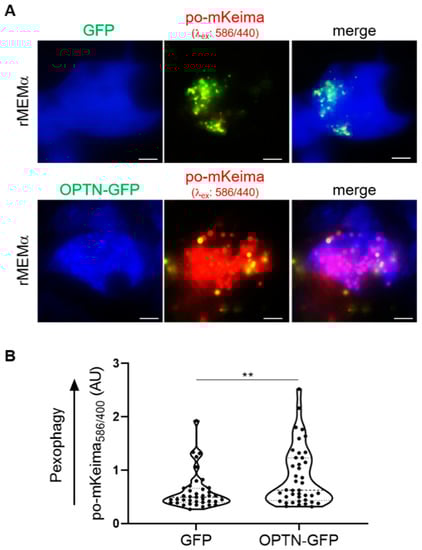 Expression of OPTN-GFP triggers pexophagy. DD-DAO Flp-In T-REx 293 cells expressing po-mKeima were first transfected with a plasmid encoding GFP or OPTN-GFP and subsequently cultured in rMEMα. Two days later, the cells were processed for live-cell imaging. (A) Representative fluorescence images of (OPTN-)GFP (false color: blue) and po-mKeima on excitation at 440 (false color: green) and 586 (false color: red) nm. Scale bar, 10 µm. (B) Random fields of view were selected in the bright field, and the 586/440 nm fluorescence excitation ratios of po-mKeima were measured and plotted. **, p < 0.01.
