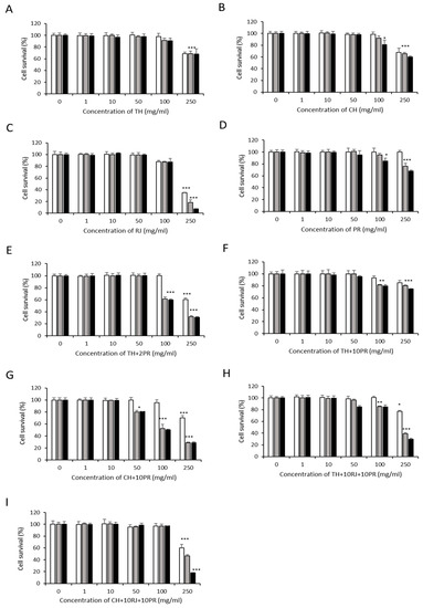 Effects of sample 1 (TH) (A), sample 6 (CH) (B), sample 15 (RJ) (C), sample 16 (PR) (D), sample 4 (TH+2PR) (E), sample 5 (TH+10PR) (F), sample 10 (CH+10PR) (G), sample 12 (TH+10RJ+10PR) (H), and sample 14 (CH+10RJ+10PR) (I) on WRL-68 cells’ viability by MTT assay. Cells were cultured with different doses of samples (0–250 mg/mL) for 24 (□), 48 (■), and 72 h (■). Asterisks indicate a significant difference from the control (0). * p ≤ 0.05, ** p ≤ 0.01, *** p ≤ 0.001.