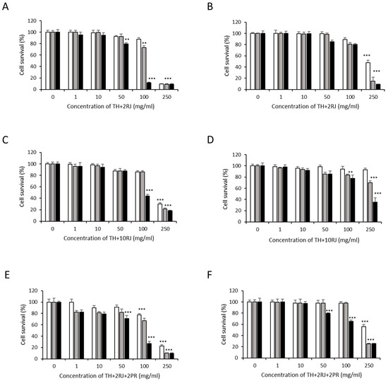 Effects on the viability of HepG2 (A,C,E) and WRL-68 (B,D,F) cells of sample 2 (TH+2RJ) (A,B), sample 3 (TH+10RJ) (C,D), and sample 11 (TH+2RJ+2PR) (E,F) by MTT assay. Cells were cultured with different doses of samples (0–250 mg/mL) for 24 (□), 48 (■), and 72 h (■). Asterisks indicate a significant difference from the control (0). ** p ≤ 0.01, *** p ≤ 0.001.