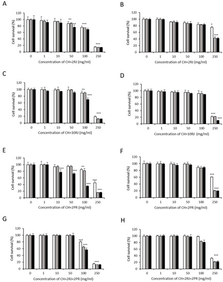 Effects on the viability of HepG2 (A,C,E,G) and WRL-68 (B,D,F,H) cells of sample 7 (CH+2RJ) (A,B), sample 8 (CH+10RJ) (C,D), sample 9 (CH+2PR) (E,F), and sample 13 (CH+2RJ+2PR) (G,H) by MTT assay. Cells were cultured with different doses of samples (0–250 mg/mL) for 24 (□), 48 (■), and 72 h (■). Asterisks indicate a significant difference from the control (0). * p ≤ 0.05, ** p ≤ 0.01, *** p ≤ 0.001.