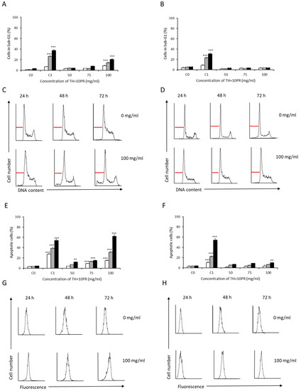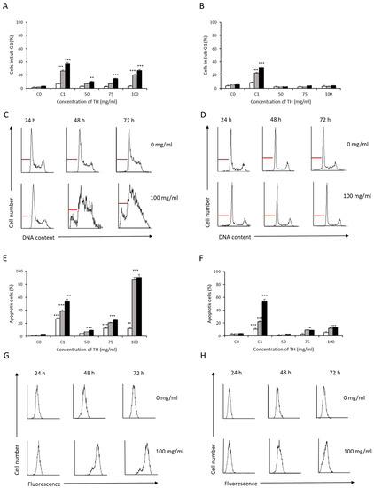 The apoptotic potential of the samples was determined via cell cycle analysis and completed using TUNEL assay. These analyses were carried out at different concentrations and for 24, 48, and 72 h of incubation, and etoposide was used as a positive control. Figure 4 shows the apoptosis induction by sample 1 (TH) on HepG2 and WRL-68 cells at 50, 75, and 100 mg/mL (24, 48, and 72 h). The cell cycle analysis exhibited an increase in HepG2 cells in the sub-G1 phase after the TH treatment (100 mg/mL, 48 and 72 h) (Figure 4A,C), but in WRL-68 cells, it did not increase the number of cells in the sub-G1 phase (Figure 4B,D). The TUNEL analysis showed that sample 1 (TH) induced apoptosis in a concentration- and time-dependent manner in HepG2 cells (Figure 4E,G), but not in normal liver cells (Figure 4F,H). The apoptotic cell population increased in HepG2 cells treated with 75 mg/mL of sample 1 (TH) for 48 (20.6%) and 72 h (25%) and was clearly evident in HepG2 cells exposed to 100 mg/mL for 48 and 72 h (86.3% and 90.2% of apoptotic cells, respectively) (Figure 4E,G). However, the percentage of apoptosis in WRL-68 cells was only 12.1% and 13%, respectively (Figure 4F,H).