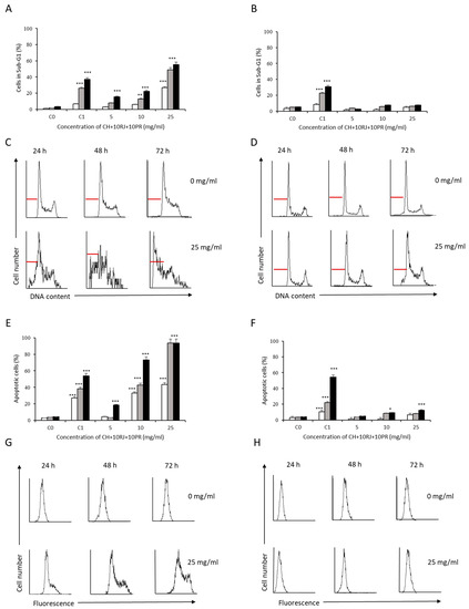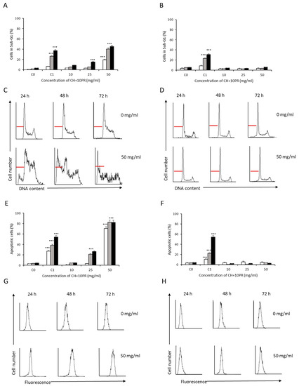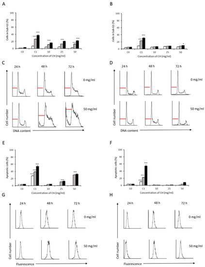 As shown in Figure 5, sample 6 (CH) induced apoptosis in HepG2 cells and did not affect WRL-68 cells. In HepG2 cells, the results confirmed an increase of cells in the sub-G1 phase (Figure 5A,C). In WRL-68 cells, no changes were produced in the cell cycle (Figure 5B,D). At 50 mg/mL, one-third of the population corresponded to apoptotic HepG2 cells (30% for 48 h and 32.5% for 72 h) (Figure 5E,G), but normal liver cells were not affected (Figure 5F,H).