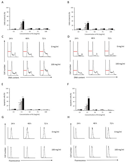 Effect of sample 15 (RJ) on human liver cell apoptosis. The cell cycle was determined using flow cytometry. HepG2 (A) and WRL-68 (B) cells were treated with different doses of sample 15 (50, 75, and 100 mg/mL) for 24 (□), 48 (■), and 72 h (■). Representative histograms of the cell cycle of HepG2 (C) and WRL-68 (D) cells are shown; the red line indicates the sub-G1 phase. The percentage of apoptosis was analyzed by flow cytometry using the TUNEL assay. HepG2 (E) and WRL-68 (F) cells were cultured with different doses of sample 15 (50, 75, and 100 mg/mL) for 24 (□), 48 (■), and 72 h (■). Representative histograms of the fluorescence intensity in HepG2 (G) and WRL-68 (H) cells are presented. C0, untreated cells; C1, cells treated with etoposide (50 µM). Asterisks indicate a significant difference from the control (C0). *** p ≤ 0.001.