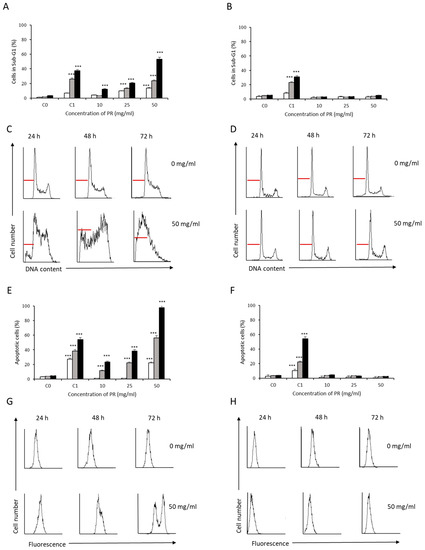 Effect of sample 16 (PR) on human liver cell apoptosis. The cell cycle was determined using flow cytometry. HepG2 (A) and WRL-68 (B) cells were treated with different doses of sample 16 (10, 25, and 50 mg/mL) for 24 (□), 48 (■), and 72 h (■). Representative histograms of the cell cycle of HepG2 (C) and WRL-68 (D) cells are shown; the red line indicates the sub-G1 phase. The percentage of apoptosis was analyzed by flow cytometry using the TUNEL assay. HepG2 (E) and WRL-68 (F) cells were cultured with different doses of sample 16 (10, 25, and 50 mg/mL) for 24 (□), 48 (■), and 72 h (■). Representative histograms of the fluorescence intensity in HepG2 (G) and WRL-68 (H) cells are presented. C0, untreated cells; C1, cells treated with etoposide (50 µM). Asterisks indicate a significant difference from the control (C0). *** p ≤ 0.001.