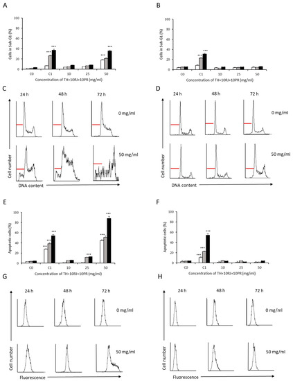 Effect of sample 12 (TH+10RJ+10PR) on human liver cell apoptosis. The cell cycle was determined using flow cytometry. HepG2 (A) and WRL-68 (B) cells were treated with different doses of sample 12 (10, 25, and 50 mg/mL) for 24 (□), 48 (■), and 72 h (■). Representative histograms of the cell cycle of HepG2 (C) and WRL-68 (D) cells are shown; the red line indicates the sub-G1 phase. The percentage of apoptosis was analyzed by flow cytometry using the TUNEL assay. HepG2 (E) and WRL-68 (F) cells were cultured with different doses of sample 12 (10, 25, and 50 mg/mL) for 24 (□), 48 (■), and 72 h (■). Representative histograms of the fluorescence intensity in HepG2 (G) and WRL-68 (H) cells are presented. C0, untreated cells; C1, cells treated with etoposide (50 µM). Asterisks indicate a significant difference from the control (C0). *** p ≤ 0.001.
