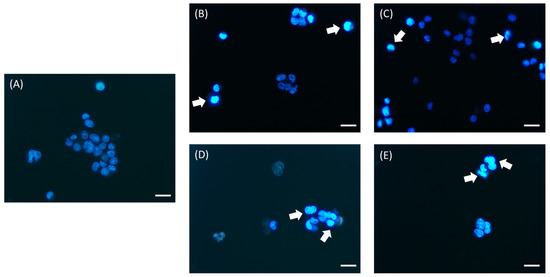Representative images (40×) of morphological changes of nuclear chromatin in HepG2 cells stained with Hoechst 33,342 and ethidium bromide. Cells were plated in the absence (A) or the presence of etoposide (50 µM) (B), sample 10 (CH+10PR, 25 mg/mL) (C), sample 14 (CH+10RJ+10PR, 10 mg/mL) (D), and sample 16 (PR, 25 mg/mL) (E) for 48 h. White arrows indicate apoptotic cells. Scale bar = 50 µm.