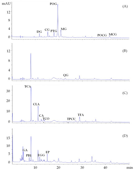 HPLC chromatograms registered at (A) 520 nm (DG = delphinidin-3O-glucoside; CG = cyanidin-3O-glucoside; PTG = petunidin-3O-glucoside; POG = peonidin-3O-glucoside; MG = malvidin-3O-glucoside; POCG = peonidin-3O-t-coumaroylglucoside; MCG = malvidin-3O-t-coumaroylglucoside), (B) 360 nm (QG = quercetin-3O-glucoside), (C) 320 nm (TCA = trans-caftaric acid; CLA = chlorogenic acid; CA = caffeic acid; TCOA = trans-coutaric acid; TPCUA = trans-p-coumaric acid; TFA = trans-ferulic acid), and (D) 280 nm (GA = gallic acid; PB1 = procyanidin B1; EG = (−)-epigallocatechin; PB2 = procyanidin B2; (−)-EGG = epigallocatechin gallate; EP = (−)-epicatechin).