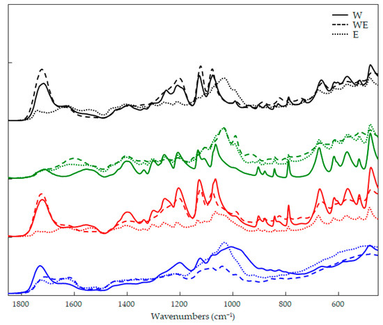FTIR spectra for the different wine lees extractions: Nocera Rosso L1 (blue line), Magliocco Rosato L2 (red line), Magliocco Canino L3 (green line), and Gaglioppo L4 (black line), extracted by water (W, solid line), ethanol (E, dotted line), and hydroalcoholic (WE, dashed line) solutions.