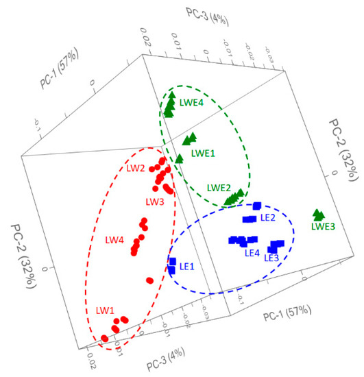 Considering the intense overlapping of the signals from different compound families, a PCA was performed to investigate more specific differences in spectral fingerprints. Figure 3 describes the 3D plot scores by considering the principal components 1, 2, and 3 with a total explained variance of 93%. The clustering of the samples was immediately evident, and it was possible to distinguish the samples according to the type of solvent used to extract the phenolic compounds. The only exception was the sample LWE3, which stood out from the others by forming a distinct group. Analyzing the x-loading values, calculated for the processed wave variables with respect to the first three PCs, some characteristic peaks for each extraction technique or cultivar were highlighted.