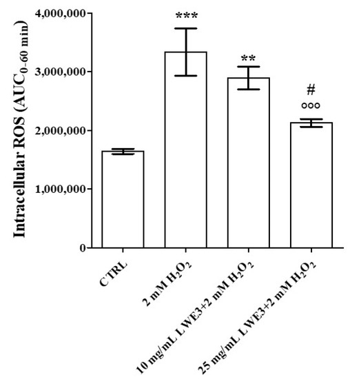 Intracellular reactive oxygen species (ROS) formation was investigated by using 2′,7′-dichlorofluorescein diacetate (DCF-DA). SH-SY5Y cells were seeded (2 × 104 cells/well) into a 96-well plate, grown for 24 h under standard conditions, treated with LWE3 (10 and 25 mg mL−1) for 5 h at 37 °C, washed with PBS, and loaded with 10 µM DCF-DA for 30 min at 37 °C. The cells, rinsed twice with PBS, were treated with 2 mM H2O2 in DMEM without phenol red and the intracellular fluorescence was read immediately for 60 min with the Thermo Labsystems Synergy HTX reader (BioTek, Winooski, VT, USA) (485 nm excitation, 528 nm emission). The Area Under Curve(0–60min) of the curve describing changes in fluorescence monitored every 5 min was calculated.