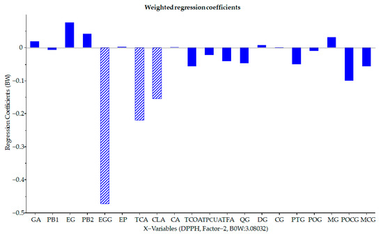First, multivariate calibration built two PLS models with very low predictive performance with R2 below 0.6 for both yDPPH and yABTS. These models were used as an initial screening of the correlation between the compound concentrations and the antioxidant power of the extracts. After evaluating the regression coefficients of each variable, it was possible to determine which of them provided the most information in the calibration of the models. Figure 5 shows the weighted regression coefficients (Bw) plot. Regression coefficients describe the relationship between all the descriptors (x-variables) and a given response (y-variable). Bw coefficients provide information about the importance of the x-variables: a high Bw value means an important role in the building of the models, while x-variables with small coefficients may be negligible; a positive coefficient shows a direct proportionality with the response, and a negative coefficient shows an indirect proportionality. The most important variables were TCA, CLA, and EGG for the prediction of yDPPH and TCA and CLA for the prediction of yABTS.