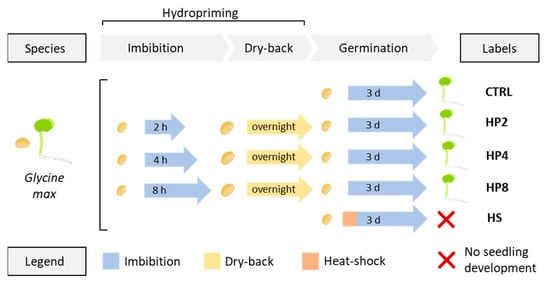 Hydroprimng (HP) treatments were conducted in a species-specific manner, especially regarding the time spent during the seed imbibition phase. For instance, in soybean seeds, HP treatments were carried out for 2, 4, and 8 h of imbibition (Figure 1). Considering the S. lycopersicum and T. aestivum systems, the HP treatments based on seed imbibition in water were carried out at different intervals of time, namely 2 h, 8 h, 24 h for tomato, and 2 h, 4 h, 6 h for wheat seeds. Subsequently, the seeds were air-dried overnight at room temperature to perform the dry-back (DB) phase of the priming treatment. The heat-shock (HS) treatment was carried out in an oven at 90 °C for 30 min for G. max and T. aestivum, while S. lycopersicum seeds were kept in the oven for 3 h. Nontreated controls (CTRL) consisting of dry seeds were also used in the experimental system. A schematic representation of the experimental design representative for G. max treatments is given in Figure 1.