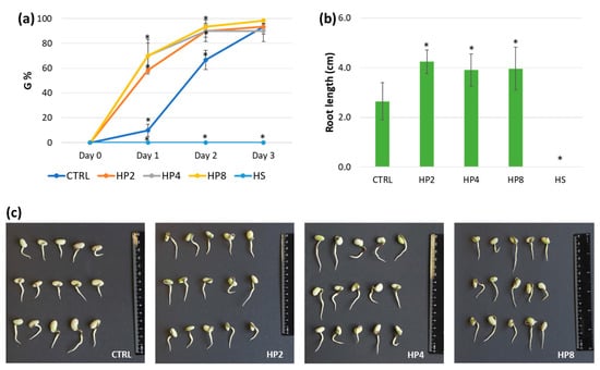 Evaluation of hydropriming efficiency in Glycine max seeds. (a) Germination percentage (%). (b) Root length (cm). (c) Representative images of germinated soybean seedlings after three days of treatments. Statistical differences among treatments and control are represented with asterisks (*). p < 0.05. CTRL, non-treated control; HP2, hydropriming for 2 h; HP4, hydropriming for 4 h; HP8, hydropriming for 8 h; HS, heat-shock.