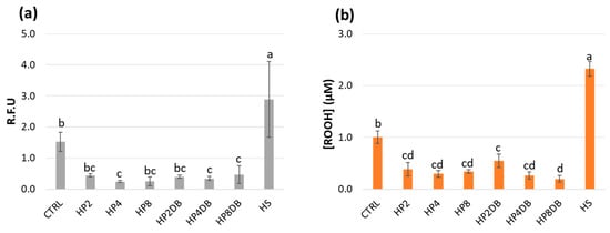 Both assays were used to assess these different aspects of ROS accumulation or release by using whole seeds. The gathered data show that the highest amount of oxidative stress (Figure 3a) and peroxide radicals (Figure 3b) are registered in seeds treated with HS. Moreover, the seeds subjected to HP treatments appeared to have the lowest levels of measured ROS, using both the DCFH-DA and FOX-1 assays (Figure 3a,b).