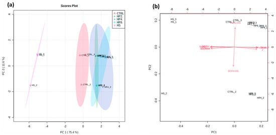 Subsequently, a PCA analysis was carried out to evidence how the different treatments (CTRL, HP, and HS) are clustered according to the obtained data. The clustering of the group of seeds subjected to the imposed treatments in G. max (Figure 4a) shows a distinct grouping of the HP treatments compared to CTRL and HS.