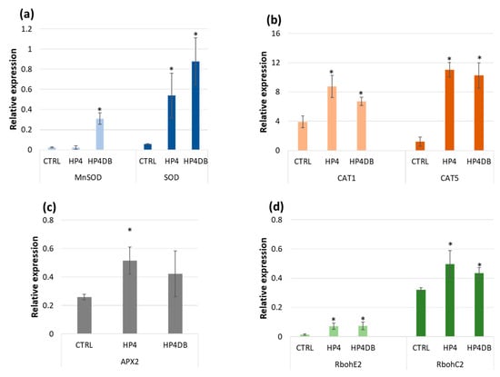 Relative expression of genes encoding enzymes involved in ROS scavenging and production mechanisms in G. max seeds subjected to hydropriming treatments. (a) Superoxide dismutases, MnSOD and SOD1. (b) Catalases, CAT1 and CAT5. (c) Ascorbate peroxidase APX2. (d) Respiratory burst oxidase homologs, RbohE2 and RbohC2. Statistically significant differences obtained by using the Student t-test (p < 0.05) are indicated with an asterisk (*). CTRL, untreated seeds; HP4, seeds soaked for four hours in water; HP4DB, seeds soaked for four hours and subjected to the desiccation required by hydropriming protocols.