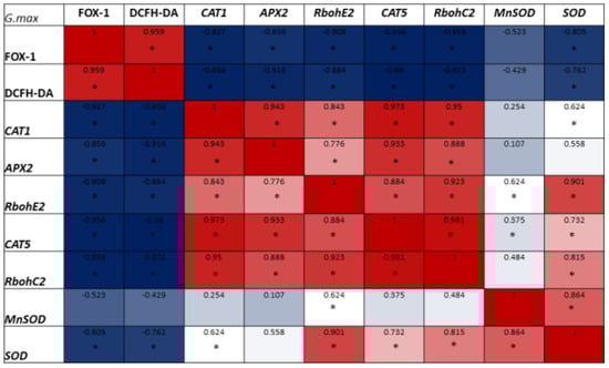 Pearson correlation indices calculated for G. max hydroprimed seeds taking into consideration the biochemical assays for ROS quantification (FOX-1 and DCFH-DA) and the ROS homeostasis gene (CAT1, APX2, CAT5, MnSOD, SOD1, RbohE2, RbohC2) expression levels. The blue color indicates negative correlations whereas red indicates positive correlations. Statistically significant correlations (p < 0.05) are indicated by an asterisk (*).
