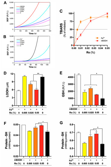 The production of mitochondrial ROS was evaluated through the kinetic measurement of dichlorofluorescein (DCF) fluorescence. When incubated with t-BOOH or Fe2+, isolated rat liver mitochondria energized by succinate immediately increased the production of ROS. Due to the nature of the oxidative stress inducer, it was possible to observe that the fluorescence increase rate was faster for the Fe2+ (Figure 1B, black line) than for the t-BOOH (Figure 1A, red line). The preincubation of the mitochondrial suspension with Ro abolished the ROS production triggered by both inducers in a concentration-dependent manner. These effects were translated into the protection of mitochondrial membranes from oxidation by Fe2+ (squares, orange) or t-BOOH (circles, red), estimated by TBARS (Figure 1C). Moreover, the formation of Fe2+-induced lipid hydroperoxides was inhibited by Ro at 0.025% (orange) and 0.05% (red) (Figure 1D). Such a lipid protective action exhibited by Ro was accompanied by the prevention of GSH oxidation by t-BOOH (Figure 1E) and the oxidation of reduced thiol groups of mitochondrial proteins by both t-BOOH (Figure 1F) and Fe2+ (Figure 1G) at the same concentrations.