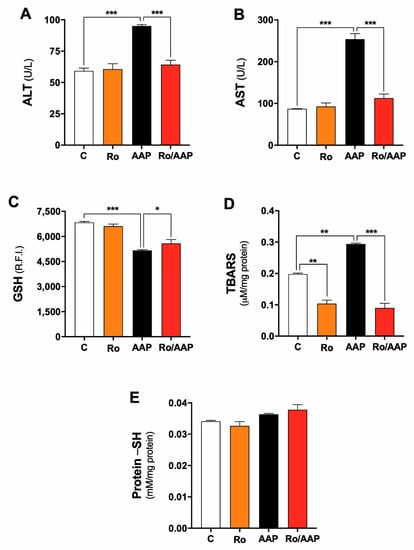 Such a hepatotoxic effect of AAP was accompanied by GSH consumption (Figure 4C, black bar) and increased lipid oxidation (Figure 4D, black bar) without affecting the reduced thiol levels of proteins (Figure 4E, black bar). Interestingly, the treatment of animals with 0.5% Ro was able to reestablish the basal levels of ALT and AST in AAP-treated animals (red bars, Figure 4A,B, respectively), indicating a complete restoration of the liver integrity against the AAP-induced toxicity. We then further investigated whether this effect was accompanied by an improvement in oxidative stress indicators. In AAP-treated rats, Ro partially inhibited GSH oxidation (Figure 4C, red bar) and completely prevented lipid oxidation (Figure 4D, red bar) without an effect on the redox state of the protein thiol groups (Figure 4E, red bar). It is noteworthy that Ro diminished even the basal lipid oxidation (Figure 4D, orange bar).