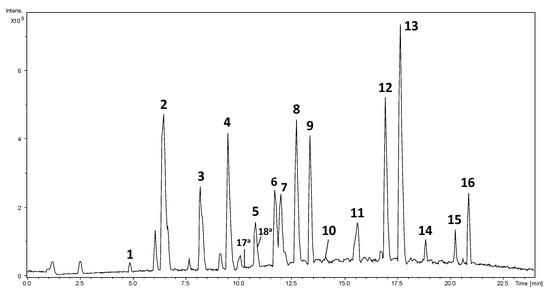 In order to gain more information about the chemical composition of Ro, we conducted an untargeted metabolomics analysis of the glycolic extract at both positive and negative ionization modes. The annotated metabolites are shown in Figure 5/Table 2 and the ion intensity of each metabolite are presented in Figure 6. As expected, several phenolic compounds already described for this plant were detected [36], e.g., caffeic acid, rosmanol, and rosmarinic and carnosinic acids. All metabolites had their annotations confirmed through a detailed discussion of the decomposition reactions in the gaseous phase [66], following the correlation with the literature recently proposed by Pilon and collaborators [67] for the analysis of glycosylated flavonoids.