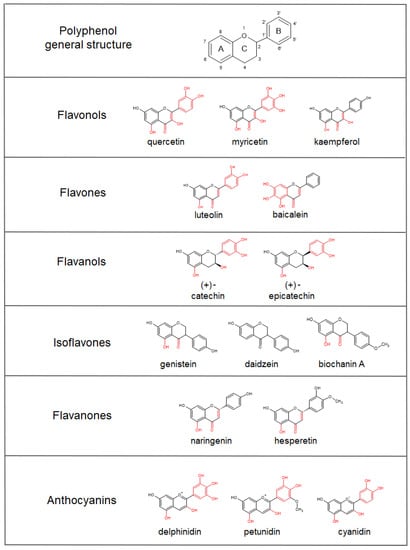 Representative classes of polyphenols and examples of compounds belonging to each group, showing different iron-chelating abilities. Polyphenol general structure is formed by two aromatic rings, indicated as A and B, linked together by three carbon atoms forming an oxygenated heterocycle, the C ring. The 6,7-dihydroxy structure, B-ring catechol, galloyl groups, 2,3-double bond, 3- and 5-hydroxylic groups, β-diketone group, and carboxylic groups associated with iron-binding properties are highlighted in red.