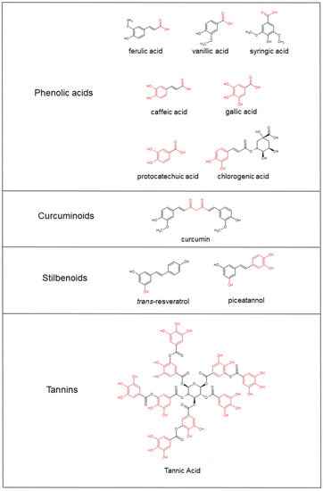 Lakey-Beitia and co-workers [68] propose the following three groups of polyphenols based on the binding sites: a group with one metal binding site, to which belong the curcuminoids, some stilbenoids, isoflavones, and flavanones; the group with two binding sites that includes some flavones and some anthocyanins; and the group with three metal binding sites that includes flavonols, flavanols, some anthocyanins, and tannins.