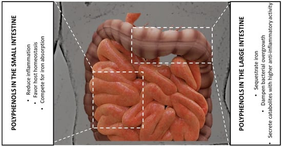 Schematic representation of the polyphenols’ role at the level of the small and large intestines, being important in the reduction in inflammation, iron metabolism, bacterial growth, and metabolite production with anti-inflammatory activities.