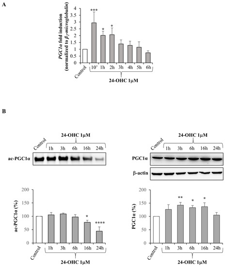 On this basis, we analyzed the ability of 24-OHC to induce, presumably through SIRT1 up-regulation, PGC1α deacetylation. In SK-N-BE cells treated with the oxysterol (1 μM), it emerged that the levels of acetylated PGC1α (ac-PGC1α) were significantly decreased from 16 h to 24 h underlying the increase in transcriptional coactivator deacetylation. Levels of total PGC1α were also measured and a significant increase in its levels was shown at almost all times considered after the 24-OHC treatment (Figure 1B).