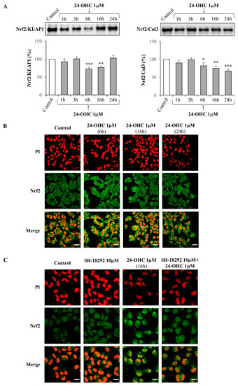 To prove that, SK-N-BE cells were incubated with 24-OHC (1 μM) from 1 h to 24 h and both Nrf2/KEAP1 and Nrf2/Cul3 complexes were analyzed. Concerning the Nrf2/KEAP1 complex, the dissociation, due to a conformation change of KEAP1, was significantly observed after 6 h and 16 h cell treatment, as shown by the lower amount of the complex; for the Nrf2/Cul3 complex, the dissociation was observed from 6 h up to 24 h cell treatment (Figure 3A). As a consequence of the repressor KEAP1 and Cul3 dissociation, Nrf2 translocated into the nucleus as detected by laser confocal microscopy: a marked nuclear translocation of Nrf2 was present already after 6 h and up to 24 h of cell treatment with 24-OHC (Figure 3B).