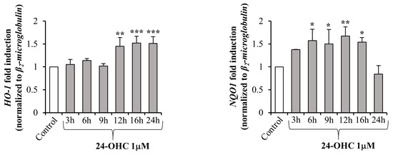 Finally, to prove the transcriptional activity of Nrf2, two antioxidant target genes of the transcription factor were analyzed: HO-1 and NQO1. HO-1 expression levels were significantly increased after 12 h up to 24 h cell treatment with 24-OHC, while NQO1 expression was significantly increased between 6 h and 16 h of cell treatment (Figure 4).