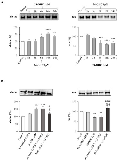 SK-N-BE cells were incubated with 1 µM 24-OHC up to 24 h and the ubiquitinated tau (ub-tau) and total tau levels were analyzed by Western blotting. The levels of ub-tau increased significantly from 6 h up to 24 h cell treatment while in parallel the levels of total tau decreased. Concerning total tau, the reduction in the protein levels was presumably due to the contemporary tau proteasomal degradation (Figure 5A).
