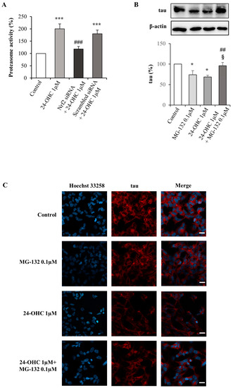 Effect of 24-OHC on Nrf2-dependent proteasome activity and on tau proteasomal degradation. (A) Proteasomal chymotrypsin-like activity was analyzed using a commercial kit. Cells were transfected for 6 h with Nrf2 or scrambled siRNA and then treated with 24-OHC (1 µM) for 24 h. The histograms represent mean values ± SD of three experiments and expressed as percentage of control value. *** p < 0.001 vs. control; ### p < 0.001 vs. 24-OHC. (B) Tau protein levels were analyzed by Western blotting in 24-OHC-treated cells for 24 h and co-treated or not with 0.1 µM MG-132, an inhibitor of proteasome activity. Representative blots are shown. The histograms represent mean values ± SD of three experiments. Tau densitometric measurements were normalized against the corresponding β-actin levels and expressed as percentage of control value. * p < 0.05 vs. control; ## p < 0.01 vs. 24-OHC; § p < 0.05 vs. MG-132. (C) After 24-OHC (1 µM) cell treatment (24 h), with or without MG-132 (0.1 µM), tau protein levels were detected by confocal laser microscopy equipped with a Plan-Apochromat 63x/1.40 DIC oil immersion objective, scale bar 20 µm. Nuclei were stained with Hoechst 33258 (exciting max/emission max: 352 nm/461 nm) and tau was revealed by a fluorescent probe (Alexa Fluor 594, exciting max/emission max: 590 nm/617 nm). The images are representative of two experiments.