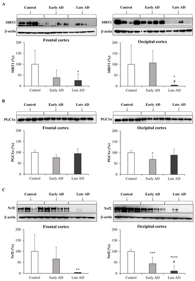 Protein levels of SIRT1 (A), PGC1α (B), and Nrf2 (C) in brain samples. Protein levels were analyzed by Western blotting in all frontal and occipital cortex specimens of AD (Early AD: n = 6; Late AD: n = 8) and of healthy subjects (Control: n = 9). Representative blots are shown. SIRT1 and Nrf2 densitometric measurements were normalized against the corresponding β-actin levels. SIRT1, PGC1α, and Nrf2 densitometric measurements of the protein levels of all AD specimens are expressed as percentage of control value. * p < 0.05, ** p < 0.01, *** p < 0.001, **** p < 0.0001 vs. control; # p < 0.05 vs. Early AD.