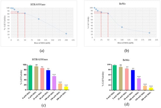 Effect of MSG on the viability of BeWo and HTR-8/SVneo cells. WST-1 assay and trypan blue staining were performed to assess and quantify cell viability (a,b) The dotted red line depicts the chosen experimental doses of MSG; the trophoblast cells HTR-8/SVneo and BeWo were also stained with trypan blue after treatment with MSG, and the results were plotted graphically (c,d). Results are representative of at least three independent experiments. ** p < 0.01; *** p < 0.001; ns (non-significant).