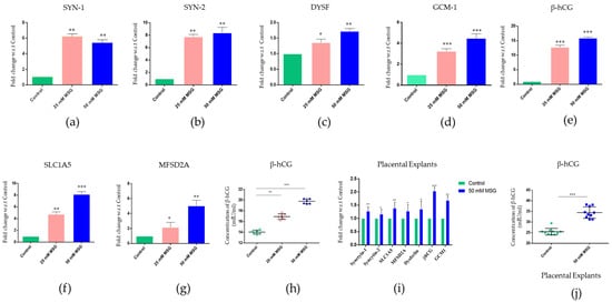 To assess the effect of MSG on trophoblast differentiation, BeWo cells were used to analyze the expression of trophoblast differentiation markers including syncytin-1 (SYN-1), syncytin-2 (SYN-2), and glial cells missing-1 (GCM1), dysferlin (DYSF), β subunit of human chorionic gonadotropin (β-hCG), solute carrier family 1 Member 5 (SLC1A5), and major facilitator superfamily domain containing 2A (MFSD2A). MSG (25 and 50 mM) significantly increased the mRNA levels of SYN-1, SYN-2, DYSF, GCM-1, β-hCG, SLC1A5, and MFSD2A (Figure 2a–g). β-hCG concentration was also evaluated in the conditioned media of cells, and significant upregulation of β-hCG level was observed after acute stimulation with MSG (Figure 2h). We next evaluated the effect of MSG in the early placental explants derived from first trimester chorionic villi obtained from medically terminated pregnancy cases (8–12 weeks of pregnancy). The expression of SYN-1, SYN-2, DYSF, GCM1, and β-hCG was significantly upregulated (p < 0.01). mRNA levels of SLC1A5 and MFSD2A, the receptors of SYN-1 and SYN-2, respectively, showed similar trends (Figure 2i). β-hCG protein levels were significantly upregulated in early explants treated with 50 mM MSG (Figure 2j). Therefore, MSG significantly upregulated trophoblast differentiation markers in trophoblast cells and tissue explants.