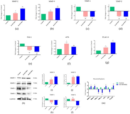 MSG alters the level of proteases and their inhibitors. qPCR showing the changes in mRNA expression of MMP−2, MMP−9, TIMP−1, TIMP−2, UPA, PAI, and PLAC8 in HTR-8/SVneo cells. The results were analyzed by the 2−ΔΔC.T. method (ΔC.T. = C.T. value of sample −ΔC.T. value of internal reference gene) (a–g); Western blot showing the levels of MMPs and their inhibitors (h); graphical representation of band intensities of proteins quantified using ImageJ. Original blots are presented in Figure S4a–e (i–l); mRNA expression of MMP−2, MMP−9, TIMP−1, TIMP−2, UPA, PAI, and PLAC8 in early placental explants treated with 50 mM MSG (n = 10) (m). All data in the figure represent mean ± standard deviation. Results are representative of at least three independent experiments. * p < 0.05; ** p < 0.01; ns (non-significant).